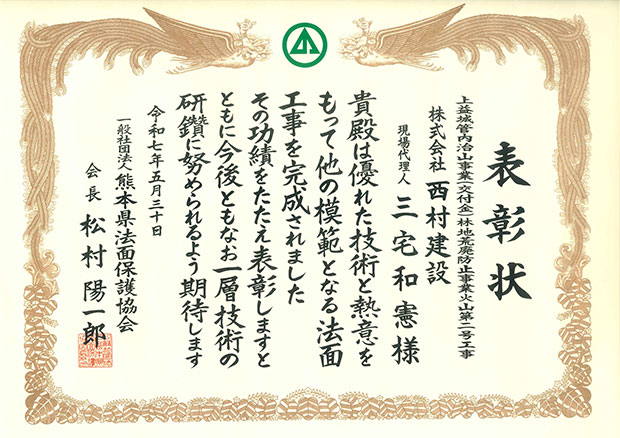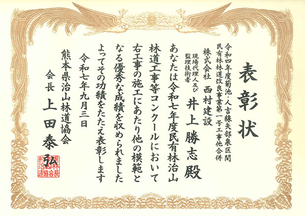上益城管内治山事業(交付金)林地荒廃防止事業火山第三号工事 令和5年表彰状 -