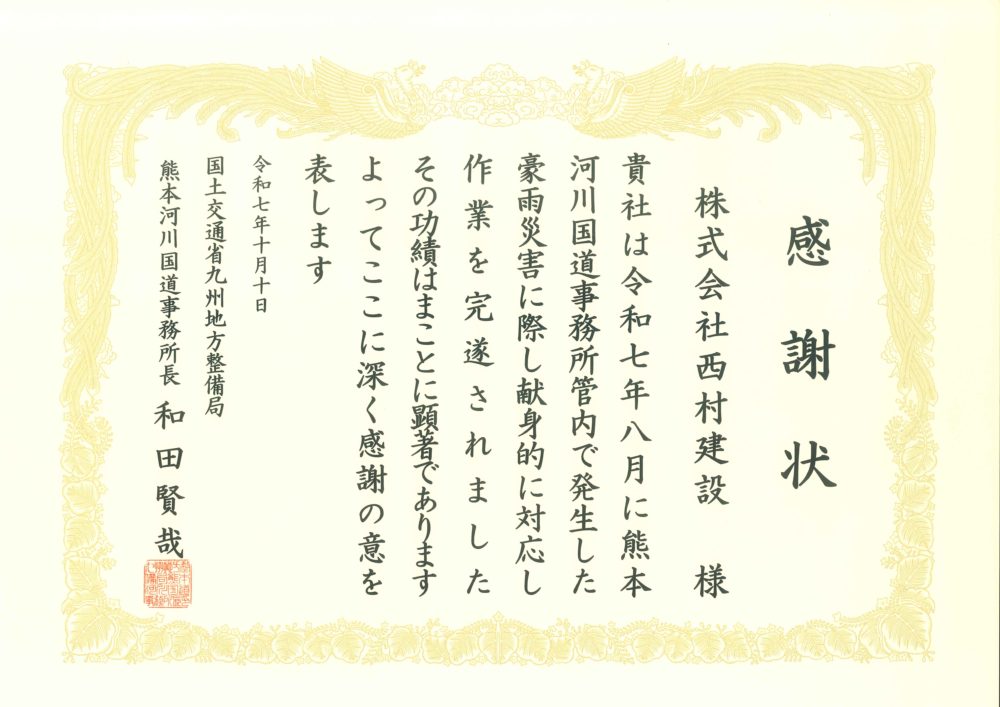 令和7年8月熊本豪雨災害における支援活動感謝状 お知らせ 2025.10.16 国土交通省 九州地方整備局様より 令和7年8月熊本豪雨災害における支援活動感謝状表彰をいただきました。 全社一丸のもと、今後もより一層技術向上に励んで参ります。 受賞歴はこちら 一覧へ戻る
